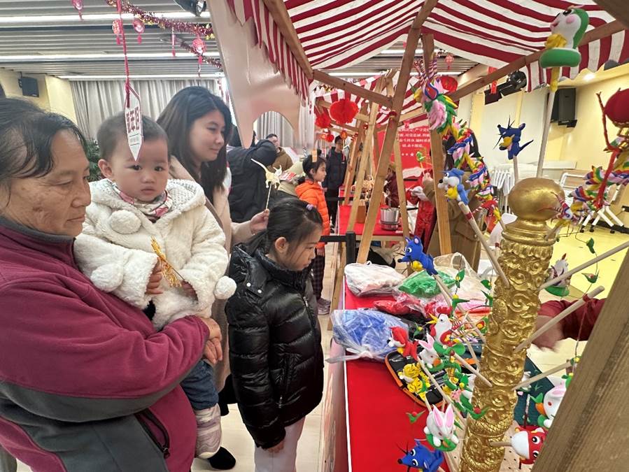 手艺表演摊位上,糖画、吹糖人等“甜蜜满分”的传统手艺项目备受居民欢迎。在糖画摊位,手工艺师以糖为“墨”、以石板为“纸”,用木签几笔勾勒出寓意吉祥的传统纹样。吹糖人摊位更是热闹非凡,晶莹剔透的糖稀从冒着热气的小锅中取出,通过手指捏、拉、扯,一个个活灵活现的小动物形象跃然掌心。现场居民积极参与,互动氛围热烈,为即将到来的新年增添吉祥喜庆的欢乐氛围。